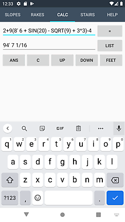 A simple calculator. Supported operators: */+-^,sin,cos,tan,asin,acos,atan,sqrt. Trig functions use degree inputs. Results are displayed to 3 decimal points. List button starts a list of results. Up/Down cycles through the memory.