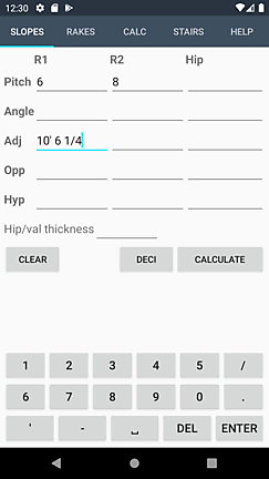 Calculates the sides and angles of right-angled triangles. For a roof adj = run, opp = rise, and hyp = rafter length. If enough information is provided to calculate R1 and R2 then a Hip rafter will also be calculated. Or just enter an adjacent or opposite to find the diagonal of a square corner etc.
