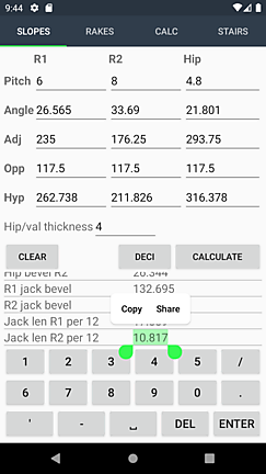 FramingCalc provides an efficient way to calculate rafters, rake walls, and stair stringers. For support contact me at framingcalc@gmail.com.