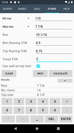 Includes option of using wall as top riser. Can be used to calculate correct rise for straight flights, winders, stairs with landings.