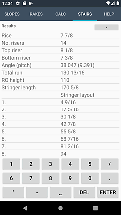 Calculates the information needed to cut stair stringers. Results are either calculated using a rough opening height and maximum riser or from a given riser and a number of treads. Provides a list of measurements corresponding to the stair tread points, this can be used to eliminate cumulative error when laying out the stringer.